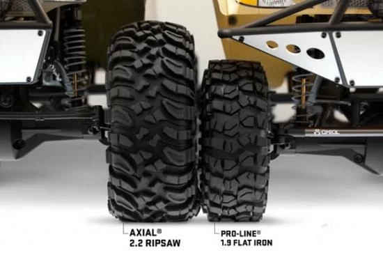 The Axial 2.2 Ripsaw Tires are a realistic looking tire for the image-conscious scale crawler, but will also help to improve performance with an aggressive tread design, the sticky R35 compound and great ground clearance. Crawlers will benefit from more ground clearance where it counts, as the Ripsaw measures 5.5″ [140mm] in diameter. This gives the lowest point on the 4X4 axle housing more clearance thus giving you more tactical driving options in those sticky predicaments!