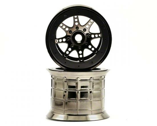 This is a set of two Axial 8 Spoke Beadlock Wheels. Do you hate having to glue up your tires? What about when you have to replace the tires and have to throw out a perfectly good wheel? Well, don’t worry; Axial has you covered with the Axial bead-lock series of wheel. All Axial wheels are made from super strong composite material and come in several high quality finishes so you can customize the look of your truck. The 17mm hex is fast becoming the standard for super strong durability and light weight performance. For those that don’t want to step up to the 17mm, Axial wheels include an adapter set that allows you to fit them to current 14mm hex hubs. The 8 Spoke Oversize wheels will fit directly on to the Savage X, T-Maxx and Revo, and fit all Axial oversize tires as well as Pro-Line 40 series tires.